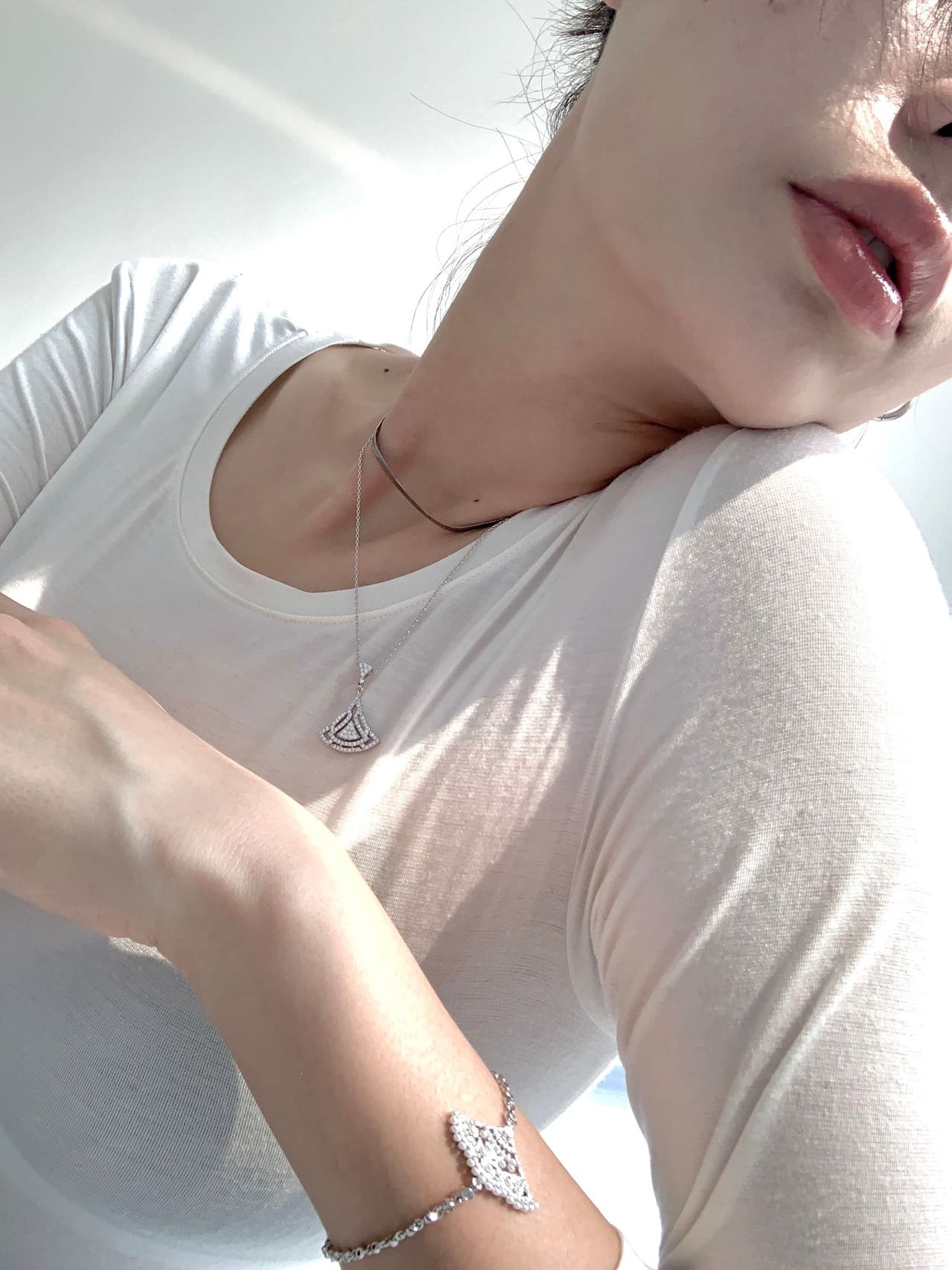 马苏身着精致镂空白纱裙,侧身立于柔和光影中,微光轻抚过她的面庞与裙摆的蕾丝,宛若一朵在晨雾中静静绽放的百合